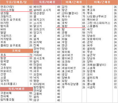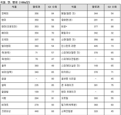 음식에 따른 GI지수=혈당지수